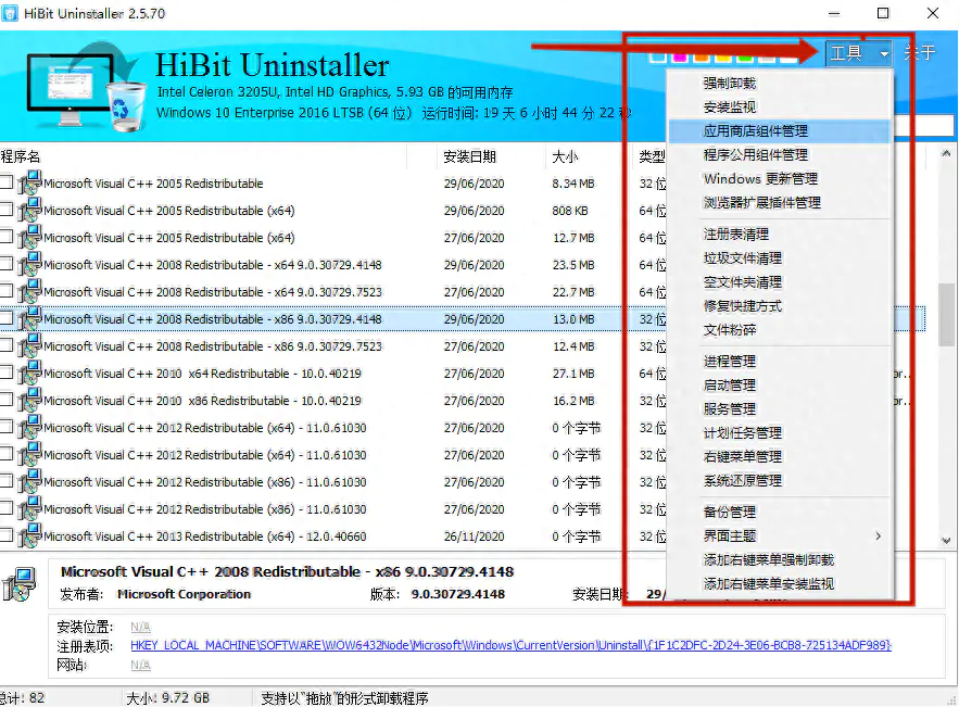 此外,HiBit Uninstaller还包含了许多可清理、优化并管理系统的工具。点击右上角的【工具】可以看到很多其它的功能。