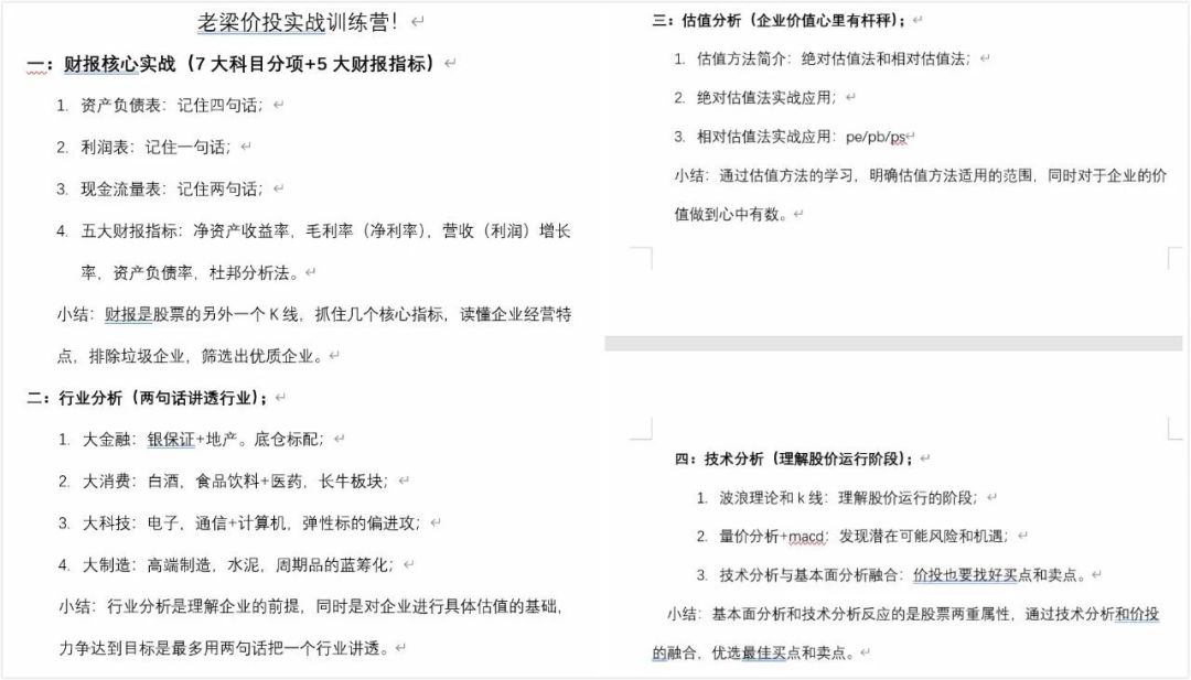四个大类,老梁将层层分解成15个大节,整个课程三十多个知识点,每一个知识点都是历经了千百次的实战锤炼出来的!比如我一直讲的,行业一定要用两句话讲透,这套课程学完,你也可以做到这个效果。